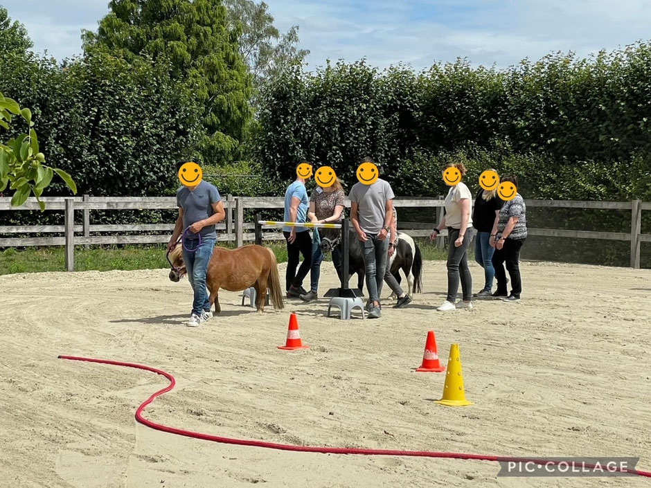 Het team bouwt samen een parcours van obstakels (ergens overheen, onderdoor en tussendoor). Ze krijgen de opdracht de route als team samen met de paarden af te leggen. Ze mogen even een paar minuutjes overleggen vooraf hoe ze dit gaan doen.